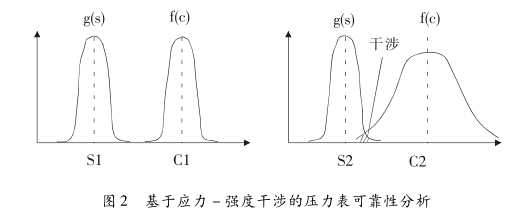 假設(shè)壓力表零件的強(qiáng)度為C,所受的應(yīng)力為S,它們 都是隨機(jī)變量,并且概率密度函數(shù)分別為f (c)與g (s)。 當(dāng)兩個分布的方差很小時,零件強(qiáng)度的最小值大于應(yīng)力 的最大值,能夠保證一定的安全裕度。壓力表投入使用 后,盡管產(chǎn)品質(zhì)量、承受載荷、環(huán)境溫度、環(huán)境振動、材料 腐蝕等因素的影響帶有隨機(jī)性質(zhì),但總體趨勢使得零件 的強(qiáng)度C逐漸下降,偏離設(shè)計時的理想?yún)^(qū)間,導(dǎo)致f (c) 與g(s)曲線出現(xiàn)重合,最終產(chǎn)生故障。