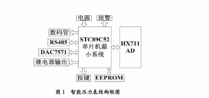 課題所設(shè)計(jì)的智能氣體壓力表由電源、單 片機(jī)最小系統(tǒng)、數(shù)碼管顯示、RS485接口、 DAC7571模擬量輸出、繼電器輸出、HX711傳感 器檢測、EEPR0M掉電存儲和異常報警模塊構(gòu) 成,如圖1所示。DAC7571芯片輸出0—5V電壓 信號,傳感器檢測10N1600A-T輸出的電壓信號 經(jīng)HX711 AD轉(zhuǎn)換輸出至單片機(jī),具體硬件電路 設(shè)計(jì)如圖2和圖3所示。