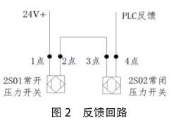 系統接受到當前反饋狀態為制動狀態,實際上系統并未發出制動 指令。由圖2可知,制動剎車反饋信號為常開的壓力傳感器開關2S01 與常閉壓力開關2S02串聯后反饋至系統。常開壓力開關2S01在27bar ?47bar時導通,常閉壓力傳感器開關2S02在0?10bar時導通,在高 于10bar時斷開。即在正常制動時2S01導通,2S02斷開,系統接收的 信號為低電平(0V);當不啟動制動時2S01導通,2S02導通,系統 接收的信號為高電平(24V)。此次故障為Feedback=1,即系統接收 到的0V,此時對應上述剎車制動狀態,但實際系統卻未發出使電磁 閥2V02和電磁閥2V03動怍的高 電平(24V)啟動剎車信號。