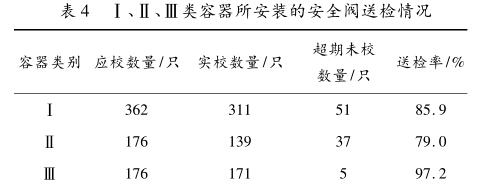 表4是將2013 ~2015年的壓力容器定期檢驗報告按容 器類別進行分類。m類壓力容器安全閥的送檢率顯著高于 III類壓力容器。