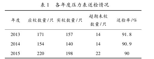 我市2013到2015年的定期檢驗報告中統計出的壓力 表送檢情況見表1。由于部分壓力容器未設計安全附件 有一些壓力容器的安全附件安裝在管路上而不在定期檢驗 范圍內所以統計得到的壓力表比壓力容器的數量要少。