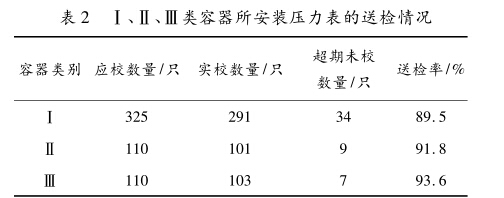 TSG R0004 - 2009 根據壓力容器的介質、設計壓力和 容積等將壓力容器劃分為IIIIII類。表2是將三年內的 壓力容器定期檢驗報告按容器類別進行分類。IIIIII 壓力容器所用壓力表的送檢率逐漸提高,m類壓力容器所用 壓力表的送檢率要顯著高于i類壓力容器。這反映出企業 對于不同類別壓力容器的安全附件重視程度有所差異