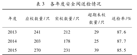 我市2013到2015年各500份定期檢驗報告中統計出的 安全閥送檢情況見表3。由于部分壓力容器未安裝安全閥, 統計得到的安全閥數量比壓力容器數量要少。