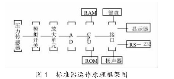 半自動化檢定系統(tǒng)中,標(biāo)準(zhǔn)器的工作原理則是利用 CST2009數(shù)字壓力檢測器,結(jié)合新型集成壓力傳感器與高 精確度的放大單元、A/D轉(zhuǎn)換儀等,針對全量程的溫度差 值實施嚴(yán)格補償,并運用單片機完成各類參數(shù)的處理、解 析以及運算,最后將面板薄膜開關(guān)當(dāng)做操控載體,設(shè)置好 系統(tǒng)內(nèi)部的各項功能。其檢定結(jié)果會通過液晶顯示器或 是RS-235接口從計算機展示出來。其具體原理框架圖如 圖1所示.