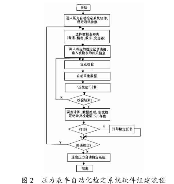 (1)檢定系統(tǒng)軟件的組建。該系統(tǒng)的檢定軟件是在 Windows中文操作系統(tǒng)的管理之下,經(jīng)由visual basic5.0 語言研發(fā)形成。系統(tǒng)在打印過程中會運用到word軟件,因 此在操作該軟件時必須要在計算機內(nèi)安裝word處理工 具。半自動化檢定系統(tǒng)包含了常規(guī)壓力表檢測、高級壓力 表檢測以及壓力變送器檢測這三大流程。在該系統(tǒng)的管 理下,計算機只能和標(biāo)準(zhǔn)表CST2009的壓力檢測器實行 通信。而自動搜集數(shù)據(jù)的過程中,該系統(tǒng)也只能搜集到標(biāo)準(zhǔn)表內(nèi)部的壓力數(shù)值與電流、電壓數(shù)值。因此,在對壓力表 實施檢定時,半自動化檢定系統(tǒng)通常會運用“反校定法”進 行檢測。該方法主要是利用人工調(diào)控壓力系統(tǒng)中的調(diào)節(jié) 閥門,并把目標(biāo)壓力表的指針固定在某一檢測點上,使壓 力數(shù)值能夠維持在穩(wěn)定狀態(tài)。在檢定軟件的調(diào)控之下,計 算機可以自動搜集CST2009顯示的數(shù)據(jù),并在程序設(shè)計 過程中利用科學(xué)的運算方法把檢測數(shù)值轉(zhuǎn)變?yōu)檎DJ?/span>, 從而使其充分滿足國家計量檢定標(biāo)準(zhǔn)的相關(guān)需求。“反校 定法”的運算公式可以表示為:被檢壓力表數(shù)據(jù)(運算 =2 x檢定點的實際數(shù)值-標(biāo)準(zhǔn)表的顯示數(shù)值。半自動壓 力表檢定系統(tǒng)的軟件組建流程如圖2所示.