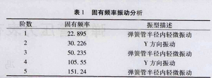 分析彈簧管的固有頻率可以發現,彈簧管的振動存在 半徑內和Y方向的這兩種,這也與實際情況是相吻合的。