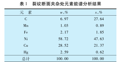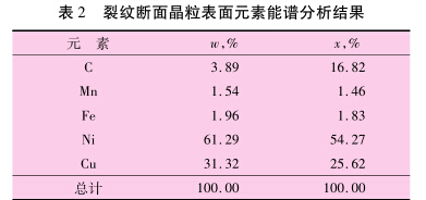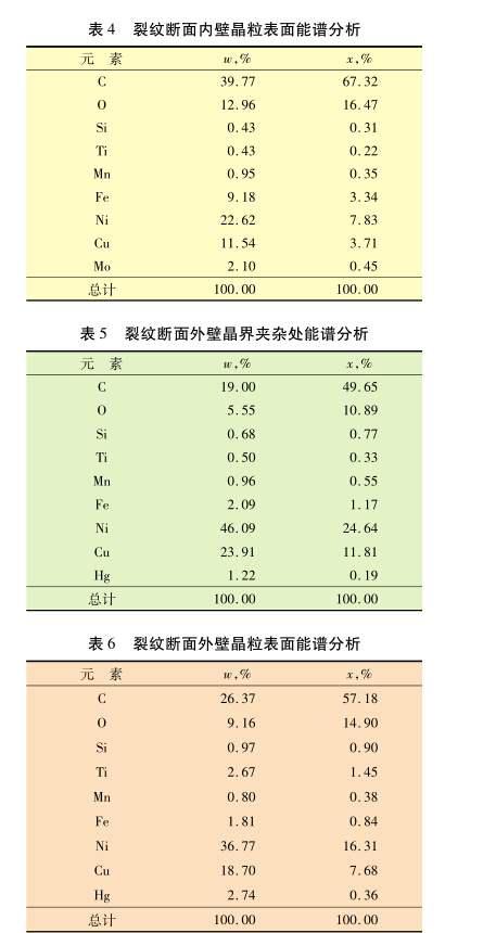 對裂紋斷口的晶粒表面進行能譜分析,結果 見表2??梢姡荚赝?,其他元素的含量與基 體相近,未檢測到汞的存在。