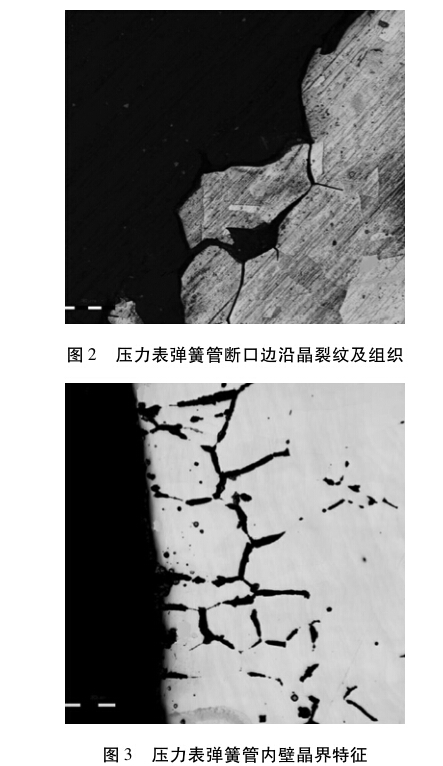 (1)壓力表彈簧管有滲透性的裂紋存在,滲 透性裂紋的斷口為沿晶擴展,并在晶界夾雜處檢 測到汞及少量的腐蝕產物。
