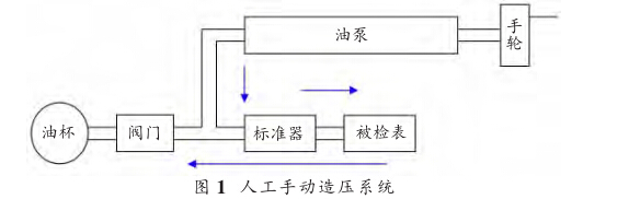 如圖1所示,我們先把標準器和被檢壓力表安裝好, 打開閥門,通過手輪向外轉帶動油泵,把油杯里的油吸入 管路中,關閉閥門,手輪向內轉動產生壓力,按照JJG52- 2013《彈性元件式一般壓力表、壓力真空表和真空表檢定 規程》的要求完成檢定后,打開閥門,油又回流到油杯中, 同時也把雜質帶入油杯中。校準一塊普通壓力表需要8分 鐘左右,對于氧氣壓力表等禁油的壓力表則需額外添加油 水分離器,校準時間需要10分鐘一塊。整個校準過程是以 人工造壓,工作強度很大。因為油介質中混入雜質,通常每 星期都會對其進行更換。即便如此,裝置單向閥亦經常堵 塞,活塞與缸筒因雜質磨損而漏油,該裝置是密封結構,檢 修工作繁瑣,活塞、缸筒的替換也是一筆不小的開支。