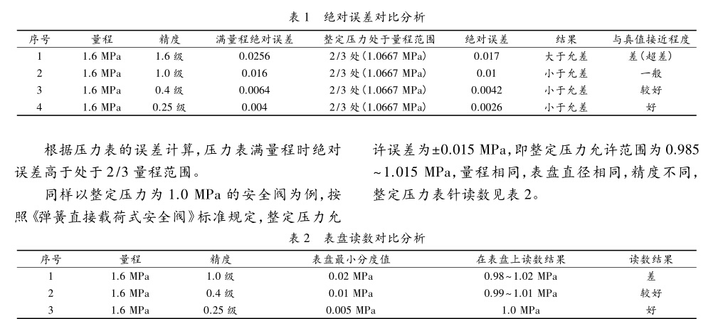 壓力表作為安全閥冷態(tài)離線校驗設(shè)備的關(guān)鍵部 ,其精度、量程等直接關(guān)系到整定壓力、密封試驗 壓力等數(shù)據(jù)的判讀,也關(guān)系到最終校驗結(jié)論的依據(jù),