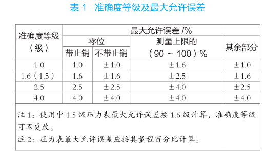 檢定規程5.1指出,壓力表的準確度等級及最大允 許誤差應符合表1規定。