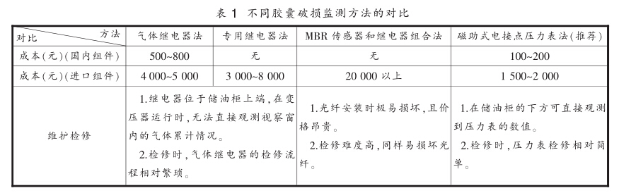 目前,我公司運用的膠囊破損監測方法有:氣體 繼電器法、專用繼電器法及MBR傳感器和保護繼 電器組合法,并已經運用在了出口項目上。下面,從 成本和維護檢修方面進行對比分析來判斷各種膠囊 破損監測方法的優缺點,對比結果如表1所示。