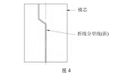 設(shè)計合理的模具分型面至關(guān)重要,是關(guān)系到坯 料成型、脫模和減少飛邊生產(chǎn)的重要一環(huán)。按照實 際產(chǎn)品的形狀、規(guī)格及尺寸,進行_模_設(shè)計,按不 同的接頭外形,進行折線分型,如圖4所示的分型線 (面),使金屬坯料較合理的傾向性流動。在凹模 (下模)內(nèi)壁的左右(蝴蝶模)或上下(上下模)分型 面距腔壁約3 ~5 mm處,設(shè)計一條凹凸型密封線, 通過加大阻尼,防止過多的飛邊產(chǎn)生。
