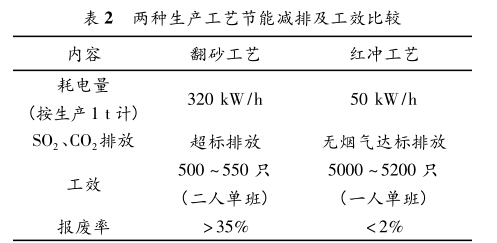 2)節(jié)能減排,提高工效。兩種生產(chǎn)工藝節(jié)能減 排及工效比較見表2。