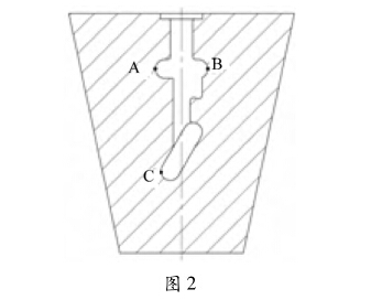 為了保證金屬制件的順利脫模,在高溫條件下, 模具與坯件之間容易產(chǎn)生粘連現(xiàn)象,導(dǎo)致脫模困難, 必須在坯件與模腔表面,涂添潤滑材料,不僅有利于 脫模,也延長模具的使用壽命。但是,潤滑材料與高 溫金屬的接觸,產(chǎn)生一定的氣體,隨著坯料的不斷入 模,模腔的頂端產(chǎn)生越來越大的氣體阻尼,不僅影響 坯料無法到位,也會因氣體的回流導(dǎo)致氣體隔層的 產(chǎn)生,使金屬難以融合,嚴重影響質(zhì)量,這種制件內(nèi) 部的質(zhì)量問題往往不易發(fā)現(xiàn)。因此,在紅沖模的設(shè) 計過程中,根據(jù)經(jīng)驗,在模具的頂端,特別是輻射狀 接頭的支端思轉(zhuǎn)角處,合理設(shè)計n個50 的排氣 孔,將氣排出,減少阻尼,防止氣體和金屬隔層,減少 積炭,如圖2中A、B、C等處,設(shè)計了排氣孔,制件在 脫模時,減少吸力,避免脫模時因真空吸力而產(chǎn)生滯 粘現(xiàn)象。