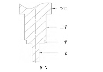 采用多節(jié)上沖頭,使坯料在模具內(nèi)按先后需要 流動,距離較遠部分先流動,距離較近部分后流動, 保證坯料均勻到位。所謂多節(jié),即按沖頭平面直徑 大小分成二節(jié)或多節(jié),如圖3所示,前端先進入的端 面截面積較小,后逐節(jié)加大。上沖模在沖壓過程中, 被先擠壓的金屬坯料一部分與上沖模形成反方向的 流動,而坯料在反向流動過程中,遇到上沖模后一級 (或封口),由于沖模截面增大,金屬坯料受到阻尼, 形成新的阻尼區(qū),由于強大的沖壓力,上沖模的第二 節(jié)、第三節(jié)及封口處,坯料被不斷持續(xù)擠壓,迫使其 不斷遞進,向前或四周不斷擠展,直至模腔頂壁,從 而使金屬制品的密度也隨之增加。