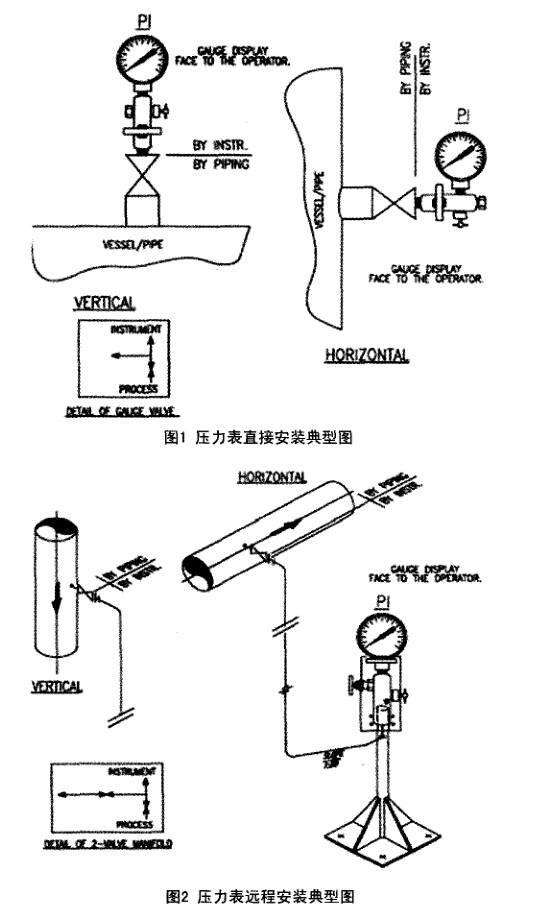 直接安裝或遠(yuǎn)程安裝需要裝配表閥來與工藝管線隔離,參 照典型安裝圖,壓力表直接安裝典型圖,如圖1所示,壓力表遠(yuǎn) 程安裝典型圖,如圖2所示。