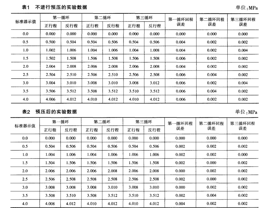 通過對不同廠家、不同量程的精密壓力表進行檢 定發現,是否采取預壓,回程誤差的數據有差異,而且 十分明顯。下面就某一塊精密壓力表不進行預壓和預 壓的檢定數據比較,可以得出更加清晰的結論。
