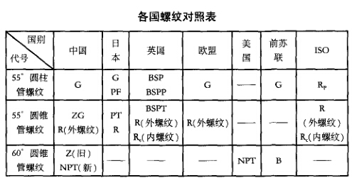 來防漏。只是各國的螺紋代號不同,使用時需要認真識別(見下表)。