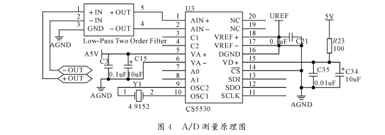 A/D測(cè)量原理圖如圖4所示。U廳是恒流電路 產(chǎn)生的電壓,提供A/D轉(zhuǎn)換器CS5530基準(zhǔn)電壓; A5V提供CS5530的模擬電源;另一路5V電源經(jīng)過(guò) 一階低通濾波器后提供CS5530的數(shù)字電源。