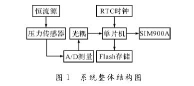 系統(tǒng)的總體設(shè)計(jì)思想是壓力傳感器在恒流源 供電的條件下,輸出與作用壓力成正比的差分信 號(hào),該信號(hào)在A/D測(cè)量部分經(jīng)過(guò)濾波、放大后以相 對(duì)測(cè)量的方式轉(zhuǎn)換為數(shù)字信號(hào);RTC時(shí)鐘為單片 機(jī)提供實(shí)時(shí)時(shí)間基準(zhǔn);當(dāng)壓力數(shù)據(jù)采集時(shí)刻到來(lái), 單片機(jī)通過(guò)光耦讀取A/D測(cè)量部分的數(shù)字信號(hào); 該數(shù)字信號(hào)會(huì)被換算為當(dāng)前壓力數(shù)值并被存儲(chǔ)在 Flash中;當(dāng)壓力數(shù)據(jù)發(fā)送時(shí)刻到來(lái),存儲(chǔ)在Flash 中的壓力數(shù)據(jù)通過(guò)SIM900A發(fā)送給服務(wù)器。系統(tǒng) 的整體結(jié)構(gòu)如圖1所示。