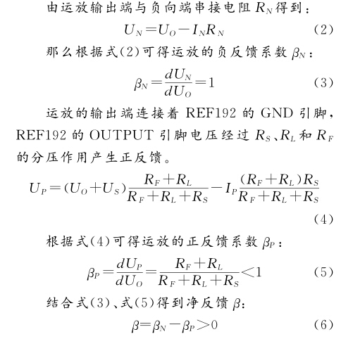 由式(1)可知恒流源的精度和穩(wěn)定性會(huì)影響壓力 傳感器輸出信號(hào)的質(zhì)量,因此對(duì)恒流源的精度、溫漂和 噪聲提出了要求。王金晨設(shè)計(jì)的恒流源中[4],負(fù)載懸 浮使噪聲增加。陳笑風(fēng)構(gòu)造的的電流源結(jié)構(gòu)[]復(fù)雜, 電阻難以匹配。本文設(shè)計(jì)的恒流源為負(fù)載接地恒流 源,具有精度高、溫漂小、結(jié)構(gòu)簡(jiǎn)單、無(wú)需電阻匹配、噪 聲低等特點(diǎn);考慮了運(yùn)放的正向端、負(fù)向端輸入電流的 影響;輸出了 A/D轉(zhuǎn)換器的參考電壓。