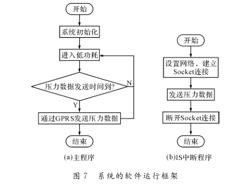 系統(tǒng)上電后,首先在主程序中進(jìn)行系統(tǒng)初始化 工作:R丁C時(shí)鐘DS3231、A/D轉(zhuǎn)換器CS5530、 Flash M25P128和UAR丁串口的初始化。然后單 片機(jī)進(jìn)入低功耗模式,暫停繼續(xù)執(zhí)行。DS3231輸 出的1S方波的上升沿會(huì)觸發(fā)單片機(jī)的1S中斷程 序。在1S中斷程序中,判斷壓力數(shù)據(jù)采集時(shí)刻是 否到來(lái),一旦到來(lái)采集壓力數(shù)據(jù)保存到M25P128 中,喚醒單片機(jī)跳出低功耗模式。1S中斷程序結(jié) 束后,主程序繼續(xù)執(zhí)行,判斷壓力數(shù)據(jù)發(fā)送時(shí)刻是 否到來(lái),一旦到來(lái)就通過(guò)SIM900A發(fā)送壓力數(shù)據(jù) 到服務(wù)器,然后進(jìn)入低功耗模式,就這樣不斷循環(huán)。 該款單片機(jī)進(jìn)入低功耗模式后會(huì)保持其引腳的上 升沿中斷和UAR丁串口發(fā)送、接收中斷的響應(yīng)。