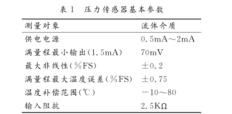 壓力傳感器采用壓阻式OEM壓力傳感器,其基 本參數(shù)如表1所示。該壓力傳感器靈敏度高、穩(wěn)定性 好、體積小、價(jià)格低廉。傳感器內(nèi)部原理圖如圖2所 示,圖中帶箭頭的電阻橋路為敏感元件,私和風(fēng)為零 位溫漂補(bǔ)償電阻,風(fēng)和風(fēng)為調(diào)零電阻,及為靈敏度 溫度補(bǔ)償電阻。+IN、一IN為供電輸入端,接入恒定 電流;十OUT和一 OUT為信號(hào)輸出端,和 U—ajT分別為十OUT和一OUT端的對(duì)地電壓。 +OU 丁與一 OU 丁之間的差分信號(hào)U—與激勵(lì)電流 IL、外界作用壓力P之間的關(guān)系如式(1):