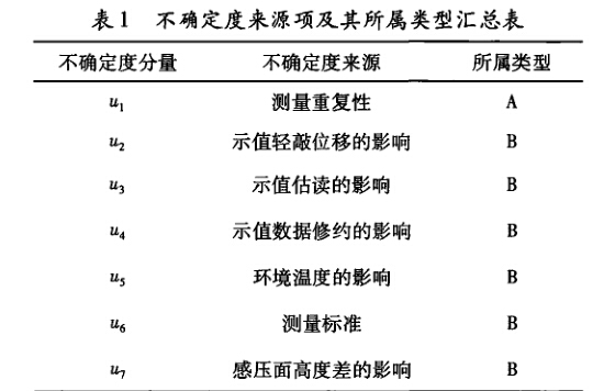 精密壓力表示值誤差的不確定度項來源及其所屬 不確定度類型如表1。