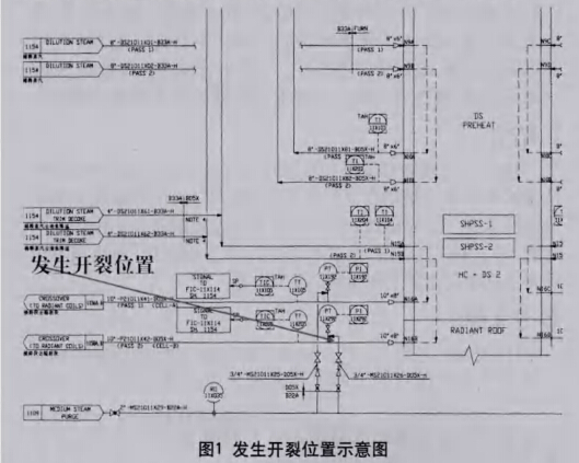 該裂解爐自二月份開工以來,已經安全運行4個月,但近 7#爐高溫橫跨段管線管件號10-P21021744-D05X-H) 的壓力表引壓管處出現物料泄露著火事故,使得該爐進行了非 計劃的退料停車,并請專家組前來進行現場調研,發現4個通 道的高溫橫跨管連接儀表引壓管處都有大約2cm的裂紋。 設計的一股吹掃防焦蒸汽的溫度與流經此處物料的溫度相差 太大