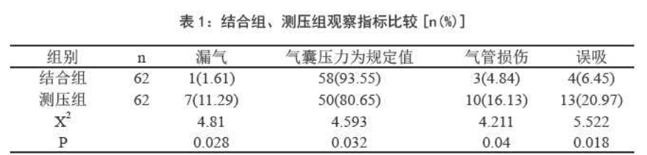 結合組中氣囊壓力被維護在規定值 的患者例數明顯多于測壓組漏氣例數明 顯少于測壓組,且氣管損傷、誤吸發生率 明顯少于測壓組.兩組數據比較差異顯著 (PC0.05),數據比較見表1。