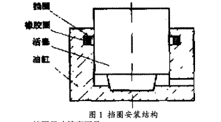 當試驗的試驗機載荷增加時,系統的壓力也會隨之增加,但如 果有油液泄露時,試驗載荷不會隨供油的增加而同步升高,即壓力 難以繼續升髙,油液泄露有內泄漏和外泄露兩種情況,外泄露一般 包含油泵異常、閥門異常和混有氣體等因素,文章不以談論,主要著 重于內泄漏的探討,即擋圈的故障原因。圖1為擋圈安裝結構。