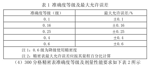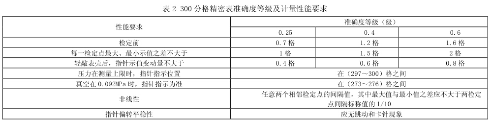 (3)準確度等級和允許誤差、示值誤差、回程誤差、輕敲位移 及指針偏轉的平穩性要求不變。其準確度等級及最大允許誤差均符 合表 1: