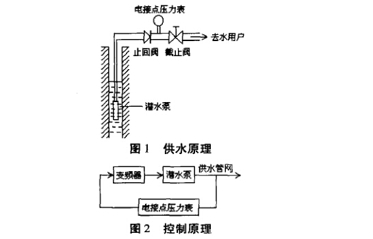 在人口稀少、居民較為分散的偏僻農(nóng)村,往往采用 深井潛水泵直接向居民供水。按照農(nóng)村居民的習(xí)慣, 家家戶戶都備有儲水罐,農(nóng)民總是在早晨、中午或晚上 回家以后把儲水罐接滿水,以備一天之用。因此,農(nóng)村 自來水供水應(yīng)定時進行’這樣既滿足了用水要求,又降 低了運行成本,節(jié)約自來水設(shè)備的運行費用。小型供 水廠一般由變頻控制柜直接驅(qū)動深井潛水泵,不再建 設(shè)水廠進行二次加壓供水,供水原理,見圖1。
