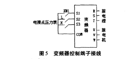 圖5所示為變頻器控制端子接線圖。圖中,數(shù)字 輸入端S1的通斷決定變頻器的運行狀態(tài),由變頻器輸 出接觸器KM1的常開輔助觸點控制,一旦接觸器KM1 閉合,輔助觸點接通,變頻器就開始運行。當KM1斷 開時,S1端無輸人信號,變頻器停止運行。H和L為 電接點壓力表的上下限觸點,可以在壓力表上進行調(diào) 節(jié)。數(shù)字輸人端S2和S3的通斷決定變頻器頻率的變 化,當潛水泵出水壓較低時,壓力表下限觸點接通,S2 端有輸人信號,變頻器頻率上升,潛水泵出水量增加。 當潛水泵出水壓較高時,壓力表上限觸點接通,S3端 有輸人信號,變頻器頻率下降,潛水泵出水量減少,從 而把供水壓力控制在所設(shè)定的上下限指針之間。觸點 H和L同時接通或同時斷開,變頻器頻率保持不變。