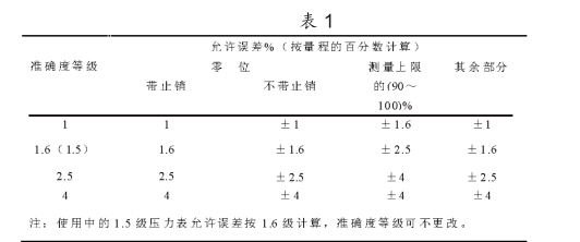 壓力表的準確度等級和允許誤差及其關系見表1。