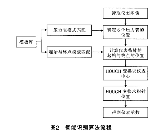 國內外提出了很多儀表識別方法:2006年,潘偉 等人利用脊波變換方法對幾種含噪聲的圖像進行直線 檢測,結果表明脊波變換能較好地提取直線特征。同年, 唐敏等人提出了一種基于自適應脊波變換的邊緣檢測 方法。這種方法以脊波變換為理論基礎,具有多方向和 多尺度性,能對圖像中不同方向的邊緣特征進行有效表 示和檢測。李盛陽、葉梧等利用圖像形態骨架細化方法 Hough變換對指針式儀表讀數進行識別。Correa.Ale_ gria等介紹了利用機器視覺對指針式儀表的檢定過程。 首先采用攝像頭采集全局的表盤圖像,然后用減影法將 兩個不同位置的指針圖像保留下來,再利用Hough變換 得到指針的角度,之后將原始圖像做幾何變換,使得表 盤上的刻度線成為一條水平線并與指針垂直,然后得到 指針的讀數。筆者所設計系統要求每次對6個壓力表進 行識別,上述方法不能直接應用到系統中。