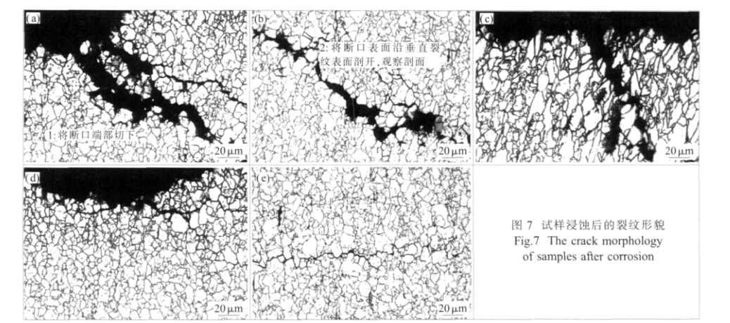 斷裂螺栓螺桿的化學成分中鉻、鎳的含量偏低, 錳、銅的含量偏高,不符合GBSS304的要求,為不合格的A2-70螺栓,這極大地降低了螺栓的耐蝕性。 同時,螺桿表面粗糙,有很多加工缺陷’這些都可以 成為點蝕,甚至是腐蝕裂紋的起始點。金相檢查結 果表明,有碳化物沿晶界分布,而裂紋均沿晶界擴 展。這可能是因為螺栓材料進行熱處理時,由于熱處 理制度不當,造成碳化物(Fe、Cr)aC6從奧氏體中析 出而分布在晶界上[5]。這種碳化物的鉻含量高于奧 氏體基體,它的析出消耗了晶界附近大量的鉻,而 消耗的鉻不能從晶粒中通過擴散及時得到補充,因 為鉻的擴散速度很慢,所以造成晶界附近的含鉻量 低于鈍化必須的限量,形成貧鉻區,因而鈍態遭到破 壞,提高了螺栓晶間腐蝕的敏感性。因此,在應力和 腐蝕介質(微泄漏的氯氣)的共同作用下,以晶間腐 蝕為起源,發展成應力腐蝕開裂,導致螺栓的斷裂。