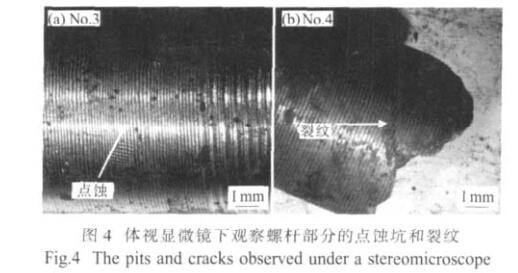 圖4為體視顯微鏡下觀察螺桿部分的點蝕坑和裂紋。可看出,在螺栓斷口附近的螺桿表面發現點蝕坑以及裂紋。另外,從圖4還可看出,螺桿表面粗糙 不平。