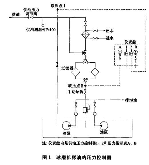 我公司2臺球磨機共配8臺稀油站,稀油站壓力 控制方式如圖1所示。使用5年以來,8臺稀油站均 存在頻繁損壞壓力表和齒輪油栗的現象。剛開始技術 人員認為是壓力表的量程小和潤滑油的雜質多所致, 對此采取了一些措施,沒有效果。后經過反復觀察,發 現稀油站啟動時油泵運轉發出尖銳、過負荷的聲音, 幾分鐘后聲音正常。