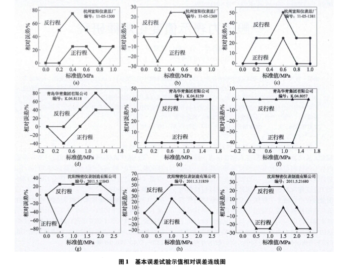 (1)基本誤差試驗相對誤差的連線以逆時針 形成閉合回路,連線無交疊,相同測量點反行程 示值恒大于或等于正行程示值。正、反行程示值 在量程中間區域達到最大值,反行程的示值最大 值為壓力表最大示值。