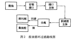 被檢壓力儀表安裝在一種壓力或真空發生裝 置上的安裝接口 1,被檢壓力儀表腔體內的殘留液 體流人接口主體3,將壓力源輸入接口 8與其牢固 連接,通過安裝接口 1注人適量凈化溶液,殘留液體 經導液管6避開壓力源輸人接口 8流入積液腔主體 9,殘留液在自身比重的作用下,可回收油會浮于積液腔主體9的上部,下部的水和污潰通過人工操作 經排污閥13由排污接嘴14排出,可回收油會經集 油接嘴12流人集油腔主體17,回收油在集油腔主 體17內通過金屬濾芯20過濾后在集油芯18周圍 囤積,回收油通過人工操作泄油閥24由泄油接嘴 25被回收。廢油循環過濾線路圖見圖2。