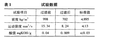 為了驗證所設計的快接式油污分離接口的過 濾能力,將日常檢測所更換下來的廢油和通過油污 分離接口進行過濾后得到的回收油的一些主要參 數進行了比對測試,試驗數據如表1所示。