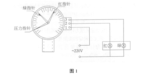 有一個常閉開關(guān)和一個常開開關(guān),就 是利用壓力表了解電接點壓力表的結(jié)構(gòu)后,再把電接點壓力表的 工作過程簡單的介紹一下:通過轉(zhuǎn)動安在玻璃蓋外面的 旋鈕,先將下限指針設(shè)定在需要的壓力值上,后將上限指 針設(shè)定在需要報警的壓力位置上。當(dāng)被測介質(zhì)壓力進入 彈簧管內(nèi),在壓力作用下彈簧管自由端產(chǎn)生位移,經(jīng)齒輪 傳動機構(gòu)放大后,指針在表盤上指示出壓力值的同時,帶 動電接點裝置的活動觸頭,當(dāng)超過下限設(shè)定的壓力時,壓 力表的指針上機械部分將常閉開關(guān)斷開,如圖1中綠燈 熄滅。壓力繼續(xù)上升,當(dāng)壓力超過上限指針設(shè)定的值時, 壓力表指針上的機械部分將常開開關(guān)閉合,如圖1此時紅燈 被接通電源,紅燈亮,提示壓力已經(jīng)超過設(shè)定上限值,需要采 取措施使壓力下降到上限值以下,這樣才安全。