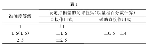 此時,大家要注意,表1中提到兩種作用方式,即直 接作用式和磁助直接作用式,兩者的偏差允許值是不同 的,一般在電接點壓力表上都會注明作用的形式,在檢定 時大家要注意看表盤,以免誤判。再做切換差的檢定,壓力表從大于上限指示的壓力開始降壓,同樣快到達 上限設(shè)定值時,改用手輪減壓,當(dāng)萬用表的鳴叫聲一斷, 這就是在上限值時的斷開壓力值。繼續(xù)降壓,當(dāng)接近下 限指針設(shè)定的值時,也同樣改為手輪降壓,當(dāng)萬用表鳴叫 的一瞬間的壓力值,即為接通壓力值?,F(xiàn)在我們得到了 上下設(shè)定點的接通和斷開的實際壓力值,根據(jù)切換差的 定義來計算實際壓力值之差,來確定是否滿足規(guī)程的要 求,從而做出壓力表合格與否的判斷(在這里同樣要注意 直接作用式和磁助直接作用式的允許值得區(qū)別)。
