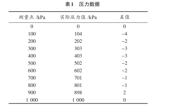 經過實驗測試,在5 V穩壓電源供電下,設計使用 量程在1 000 kPa下,采用3點標定校準的情況下,數字 壓力表顯示的數據跳動范圍為1~4 kPa,數據顯示較為 穩定,能夠達到0.5級的精度要求。如表1所示的壓力 數據。