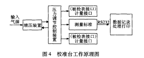 設計校準臺主要由增壓裝置、壓力調節控制裝置 組成;再增加拓展部分:用于顯示數值的測量標準、 記錄數據的軟件部分;參考一般的活塞式壓力計結構, 擬配兩個被檢表接口,一個測量標準(標準表)接口, 則可實現同時校準兩塊被檢表。如圖4所示,校準臺 的工作原理為:使用外接氣源輸人預增氣體壓力,經 增壓裝置升壓后,由壓力調節控制裝置控制輸出壓力, 并根據被檢壓力表校準點壓力的大小進行適量微調, 控制輸出需要的校準壓力被檢表和測量標準同時測 量這一壓力值。測量標準通過RS232接口將數據傳輸 到軟件端進行記錄、存儲,由軟件處理后給出校準結 果或打印。