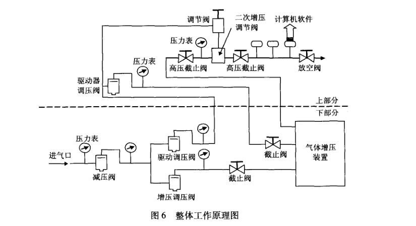 下部置進氣口,配減壓閥,可將現場提供的氣源 壓力減壓至所需預增氣源和驅動氣源壓力。將危險性 較大的增壓裝置置下部,進行氣體的升壓,發生萬一 也盡量降低對人員的損傷。整體工作原理圖如團6 所示。