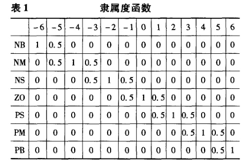 取誤差e和誤差變化~的論域為[-6,6],\、 的論域也為[-6,6]。所有語言變量的量化 等級都為 13 級,即{ -6, -5,-4,-3,-2,-1,0, 1,2,3,4,5,6}。