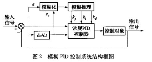 模糊PID控制是以模糊集合論,模糊語言變量 和模糊邏輯推理為基礎的一種數字控制,它以誤差 e和誤差變化ec作為輸入,利用模糊控制規則在線 對PID參數進行修改,以滿足不同誤差e和誤差變 化e。對控制參數的不同要求,使被控對象有良好的 動、靜態性能。模糊PID控制系統結構框圖如圖2 所示。